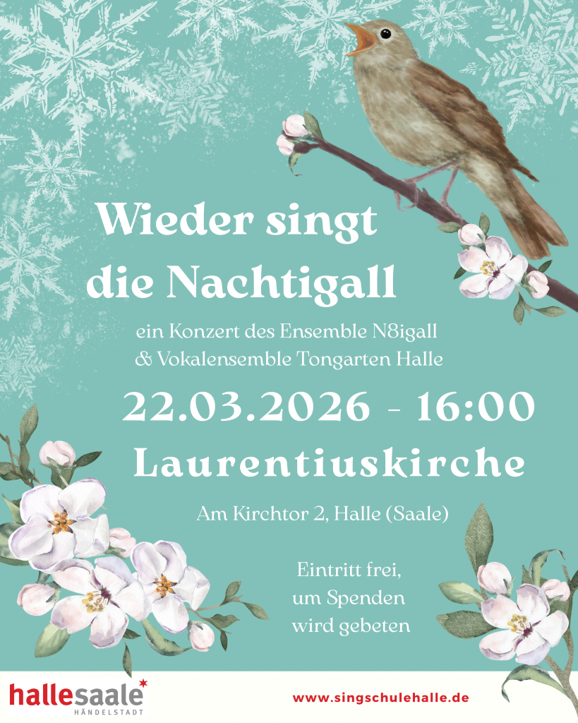 Das Ensemble N8igall und das Vokalensemble Tongarten lädt zum ersten Konzert des neuen Jahres ein. Mit Volksliedern, Liedern der Romantik und Pop wollen wir uns auf den Übergang der Jahreszeiten einstimmen. Die Ruhe des Winters, Schneegestöber und Kälte weichen Tau, sprießenden Knospen und dem Gesang der Nachtigall. Lassen Sie sich mitreißen und begrüßen Sie gemeinsam mit uns die ersten Sonnenstrahlen des Frühlings.