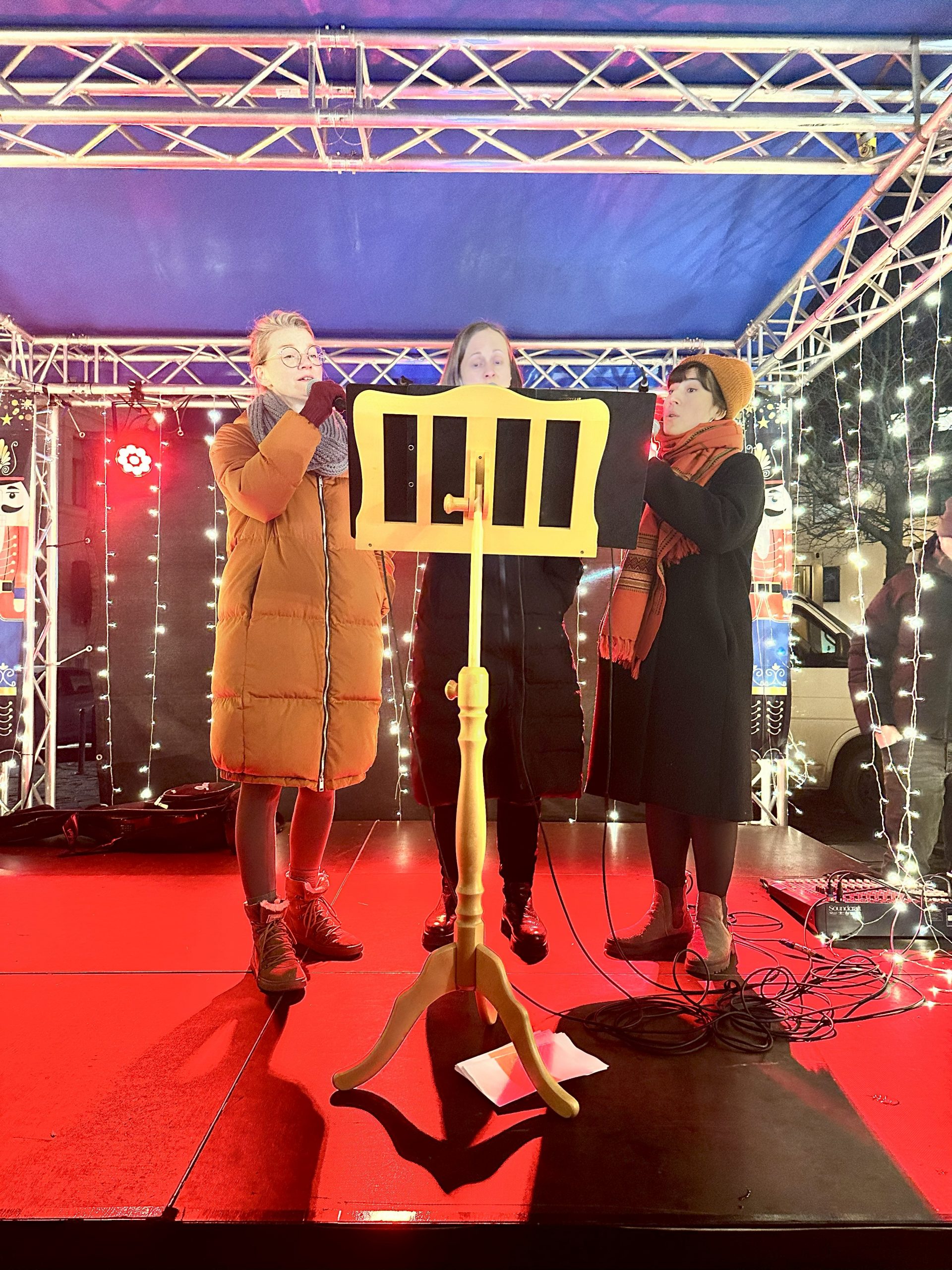 Unsere drei Stimmbildnerinnen Anna G., Anna M. und Anna U. bezauberten engelsgleich das Publikum des kleinen Weihnachtsmarktes am Dom. Auf einer kleinen Bühne sangen die Drei weihnachtliche Lieder und luden das Publikum des Weihnachtsmarktes zum Mitsingen ein. Neben dem wunderbaren weihnachtlichen Klang konnten auch Glühwein und Naschereien genossen werden.