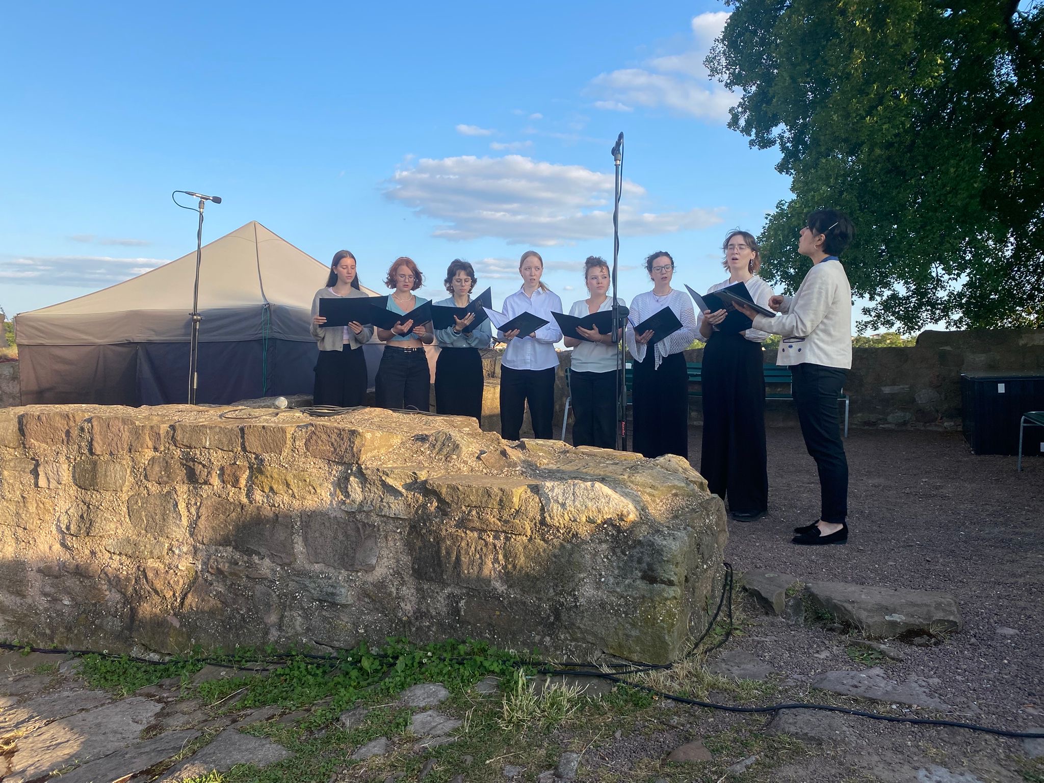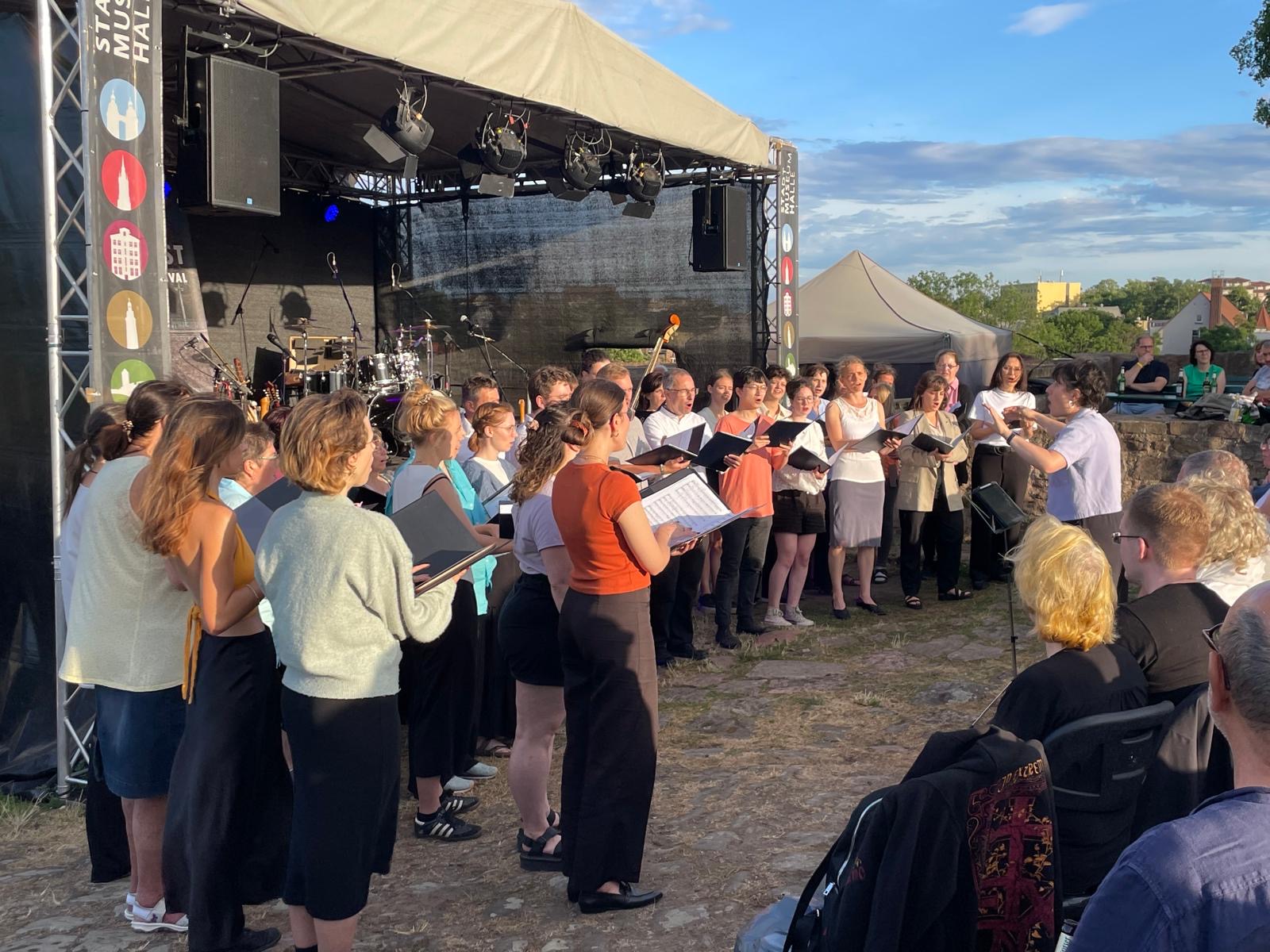 Unser Mädchenensemble sowie unser Gemischter Chor nutzten das sommerliche Wetter im Juni und eröffneten jeweils eine Veranstaltung des Trotzburgfestes als musikalischen Vorgeschmack. Unser Gemischte Chor durfte dabei sogar die hallesche Band „Horch“ begrüßen und anschließend dem ausverkauften Konzert lauschen. Dieser ganz besondere Auftrittsort über den Dächern von Halle mit wunderschönem Ausblick auf die Saale war der krönende Abschluss der zweiten Hälfte des Schuljahres 2024/25.